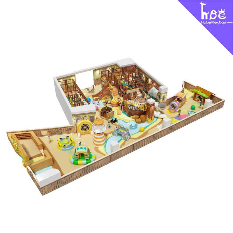 Um parque infantil interior com tema de navio pirata, apresentando uma estrutura de jogo no estilo de um castelo travesso, com um design de textura de madeira e esquemas de cores inspirados na praia e no mar. No coração do local, encontra-se uma enorme peça central de navio pirata acolchoada, complementada por áreas de desafio ninja e escorregadores em espiral, todos trabalhando juntos para recriar o ambiente de um paraíso pirata à beira-mar.