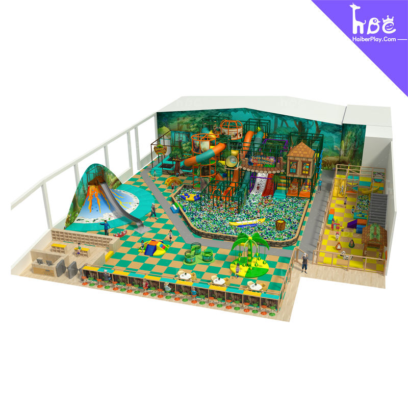 Um parque infantil interior com tema de navio pirata, apresentando uma estrutura de jogo no estilo de um castelo travesso, com um design de textura de madeira e esquemas de cores inspirados na praia e no mar. No coração do local, ergue-se uma enorme peça central de navio pirata com acolchoamento macio, complementada por áreas de desafio ninja e escorregas em espiral, todos trabalhando juntos para recriar o ambiente de um paraíso pirata à beira-mar.